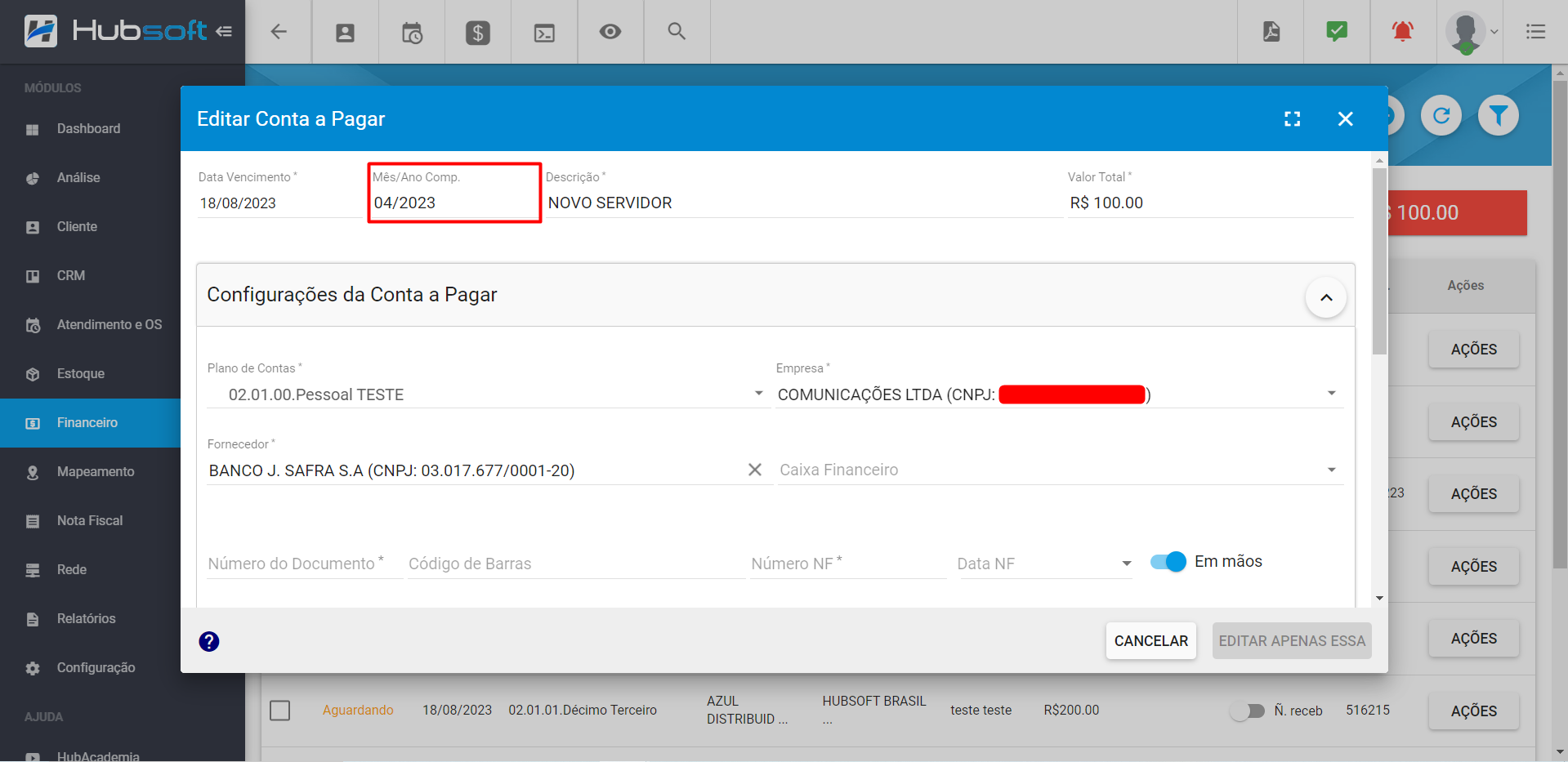 A Competência é um método utilizado para realizar o registro de lançamentos na data em que o evento acontece. Ou seja, é preenchido com a data em que àquela Despesa foi realizada, não importando quando será o vencimento das contas a pagar. Com esse novo campo, o provedor poderá informar o mês e o ano da competência da conta a pagar.