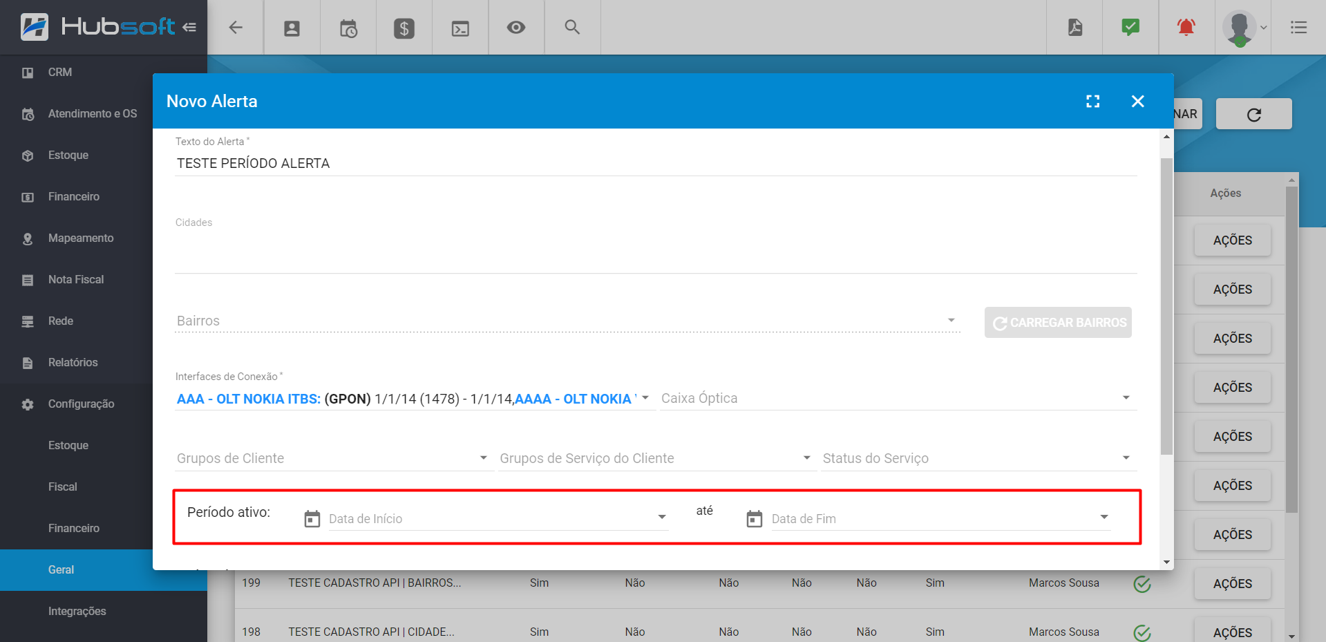 A partir desta versão, será possível definir um período para que o alerta seja exibido. Teremos os campos de data início e fim para que o usuário possa preencher de acordo com o período desejado para o alerta.
