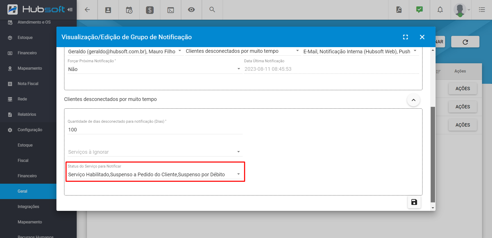 Incluímos um novo filtro nas configurações do grupo de notificação Clientes desconectados por muito tempo, agora será possível definir o status do serviço que deve ser trago no relatório gerado.