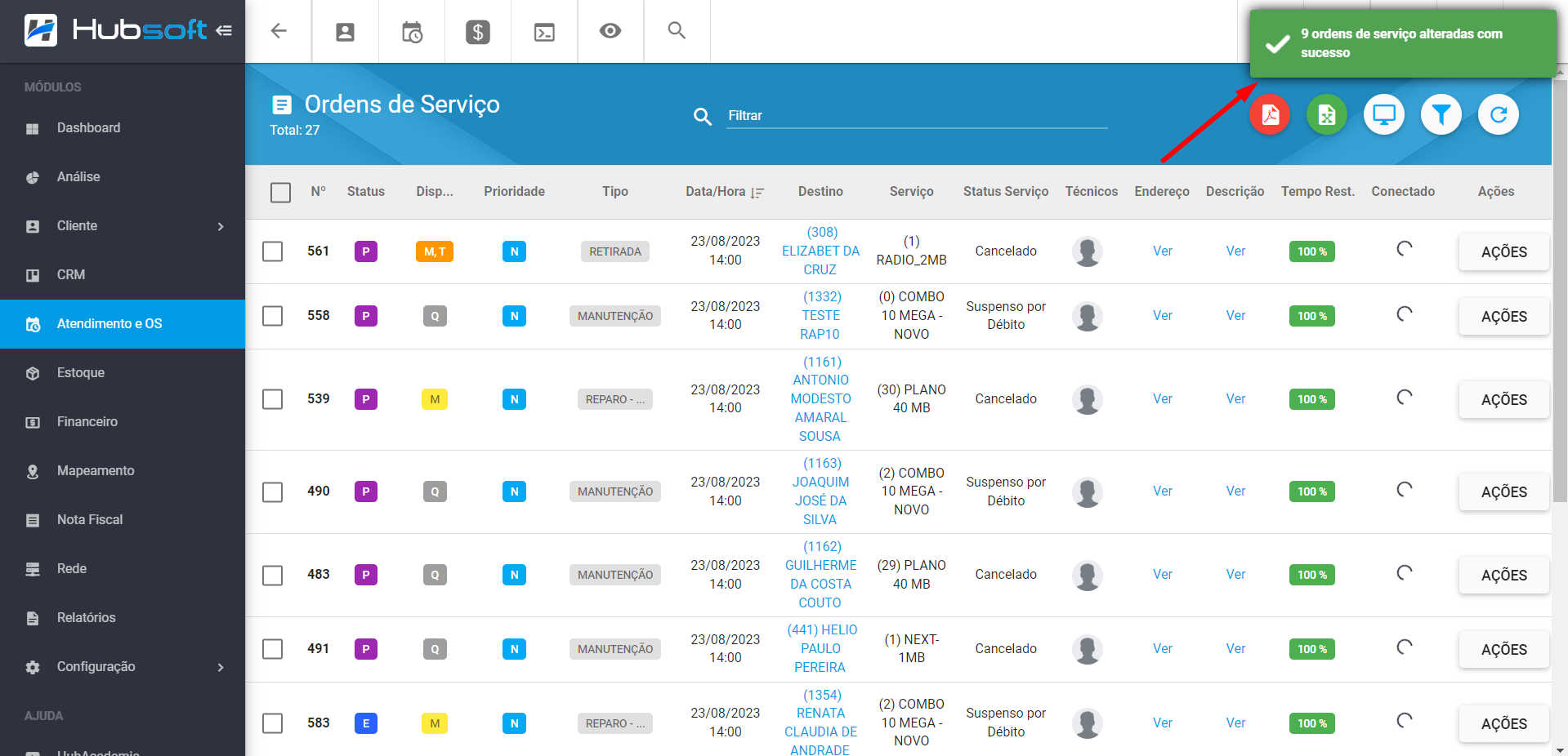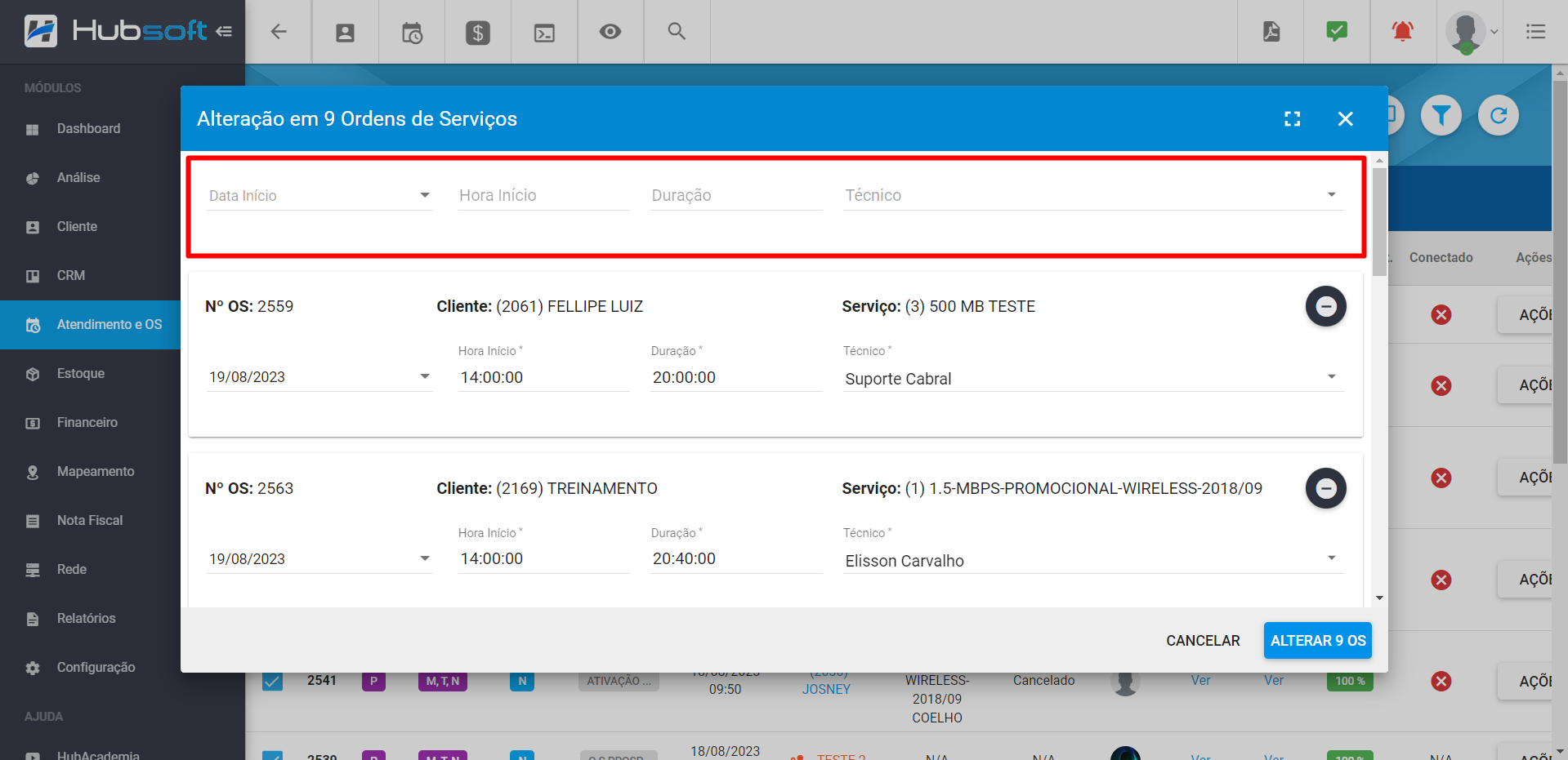 Será implementado em Atendimento e OS > O.S (Lista), a possibilidade de alterar o técnico massivamente nas OS que estiverem com o status Pendente ou em Execução. Essa regra irá validar a Agenda do Técnico, caso não permita a Sobreposição de OS, o sistema irá retornar um alerta referente ao técnico.