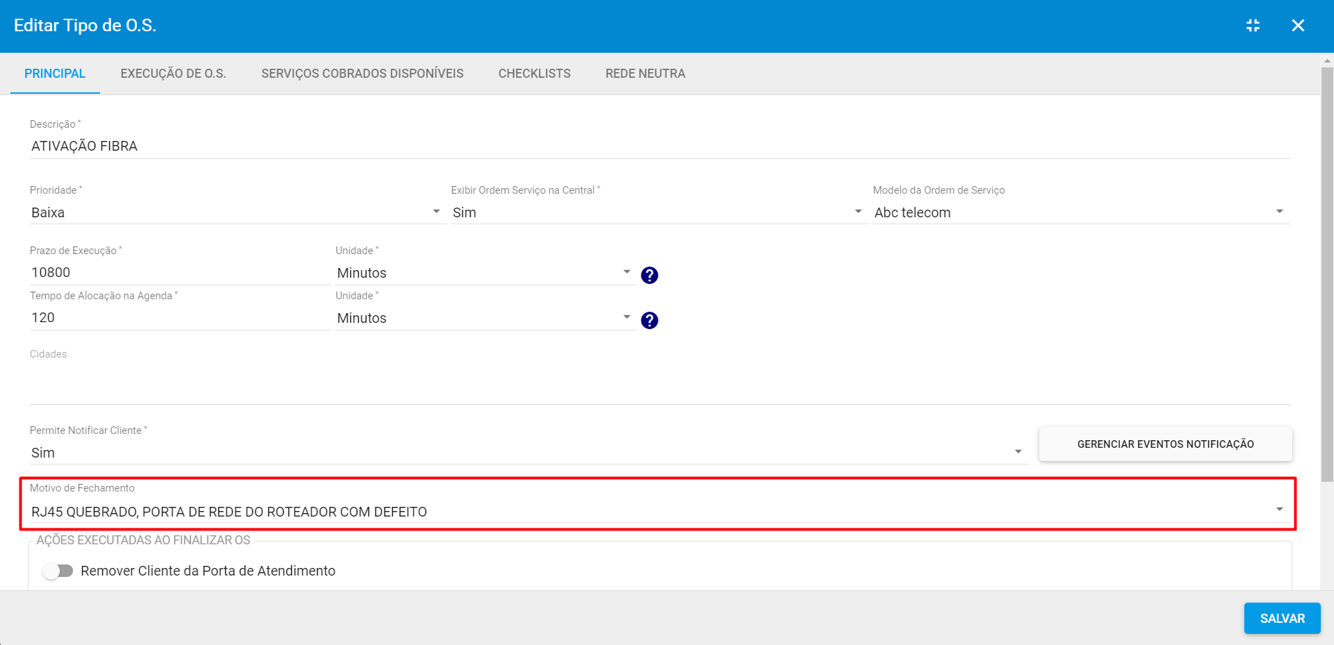 A partir desta versão, conseguiremos definir os Motivos de Fechamento dos Atendimento e também os Motivos de Fechamento das Ordens de Serviço que serão exibidos ao finalizar um Atendimento ou uma OS. Caso o provedor defina os motivos nas configurações dos Tipos de Atendimento ou dos Tipos de OS, ao finalizar aquele atendimento ou a OS, serão exibidos somente os motivos selecionados. Caso não haja nenhum motivo definido, todos os motivos serão listados.