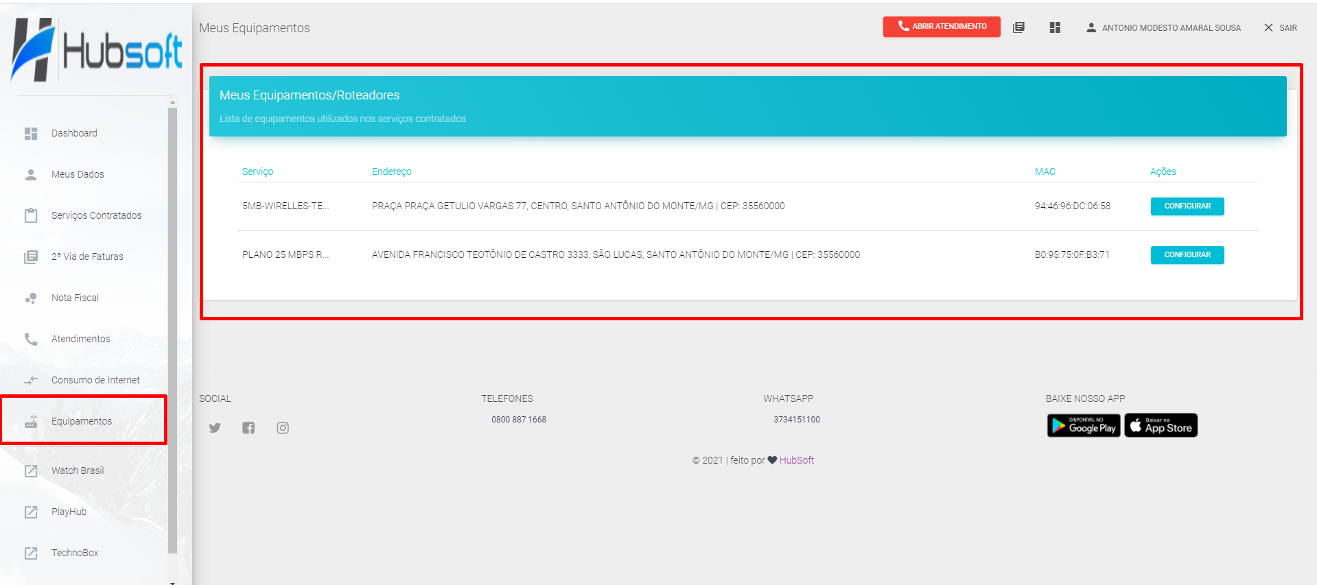 Ao acessar a Central do Assinante, o cliente do provedor terá acesso a aba “Equipamentos”, que exibirá todas as CPEs gerenciáveis vinculadas a seus planos, ao clicar em Configurar, o usuário poderá fazer a alteração dos parâmetros.