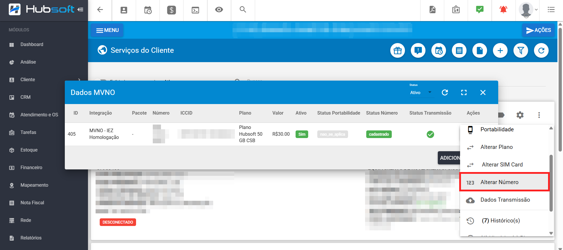 Para realizar a alteração do Número, acesse Dados MVNO > Ações > Alterar Número.