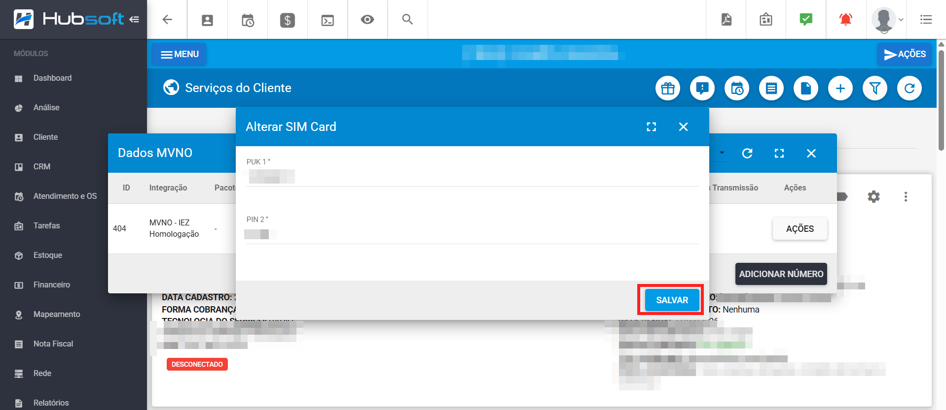 Caso o serviço do cliente, que contém os Dados MVNO, for suspenso/habilitado aqui no sistema, eles serão colocados na fila de transmissão para bloqueio/desbloqueio também na plataforma.