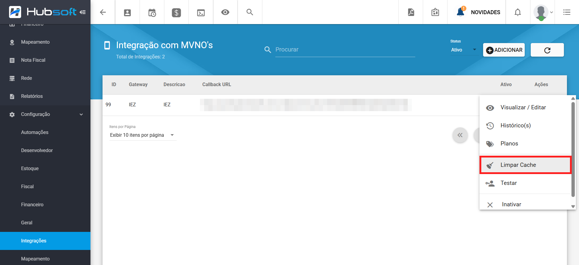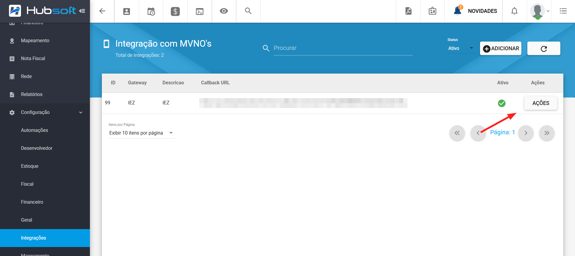 Para adicionar a integração no sistema seria em Menu lateral > Configuração > Integrações > MVNO > Adicionar.