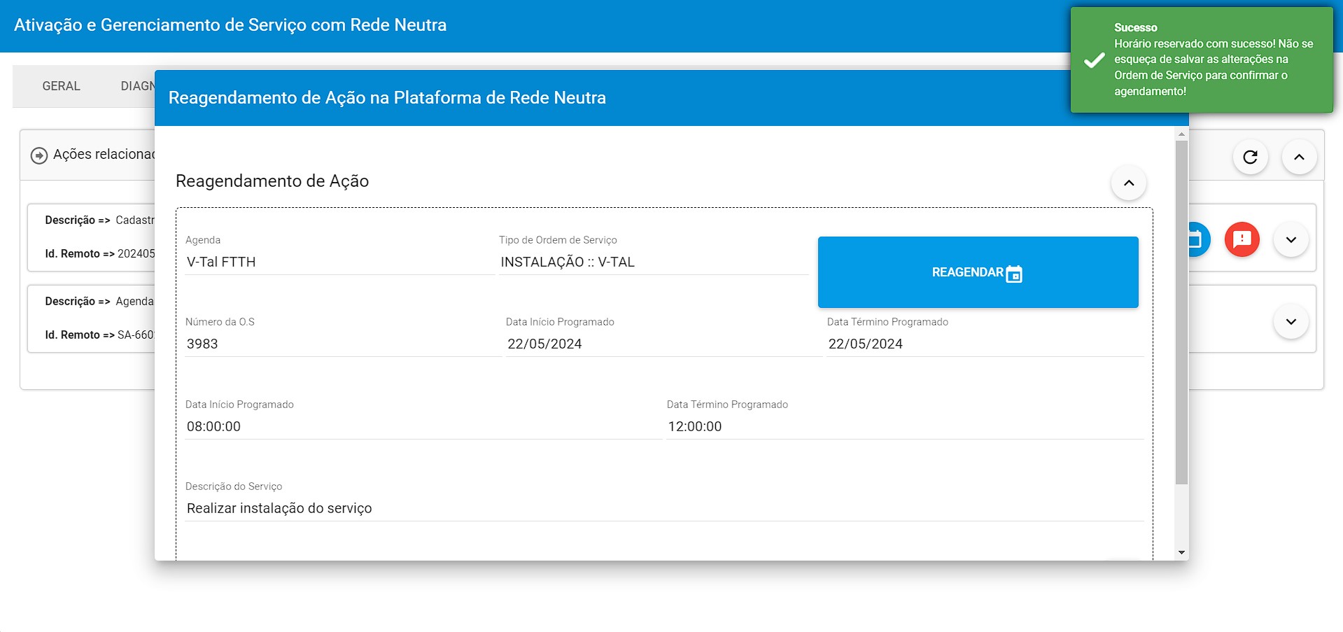 Ao reagendar a O.S, o usuário deverá entrar em contato com o cliente e realizar o reagendamento do novo horário, selecionando os horários disponíveis na agenda. Clique em Reagendar e defina os dados.