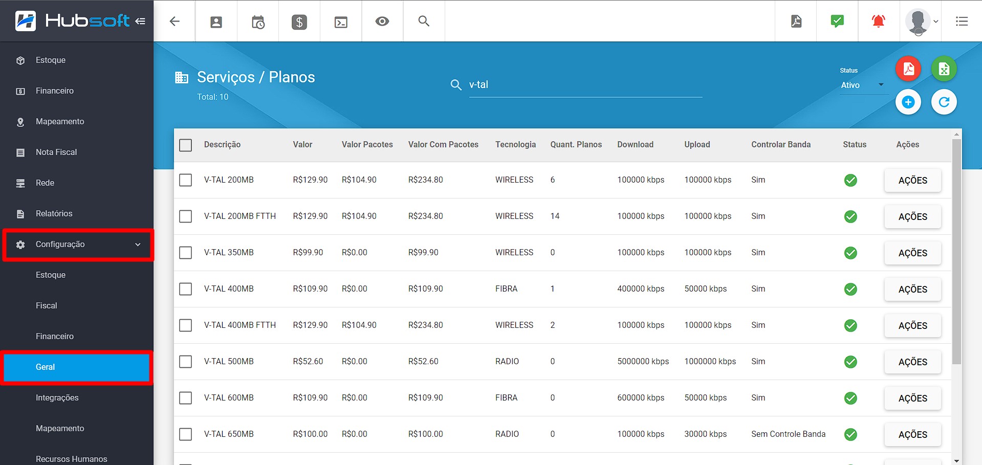 Para que seja possível cadastrar novos assinantes e planos que irão utilizar a rede neutra, primeiro é necessário cadastrar os serviços que serão vendidos em Configuração > Geral > Serviços.
