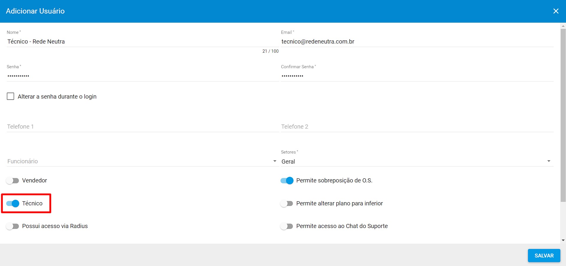 Ao utilizar o modelo de contratação como FTTH, será necessário cadastrar um novo técnico. Isso é importante para garantir que ao abrir uma Ordem de Serviço destinada à rede neutra, a mesma não seja atribuída a um técnico do provedor de acesso à internet, evitando conflitos na execução da O.S. A inclusão de um novo técnico pode ser feita normalmente em Configuração > Geral > Usuários.